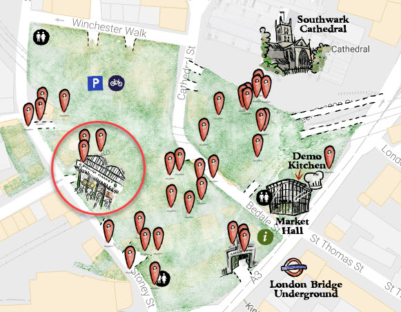 การเดินทางมาตลาดนี้ไม่ยาก นั่งรถไฟใต้ดินมาลงที่สถานี London Bridge แล้วหาทางออกที่ไปตลาด Borough Market ซึ่งไม่ไกลจากสถานีเท่าไร ดูแผนที่ได้จากด้านล่าง