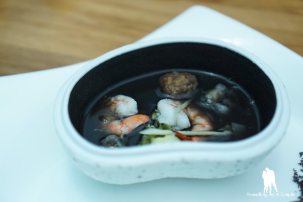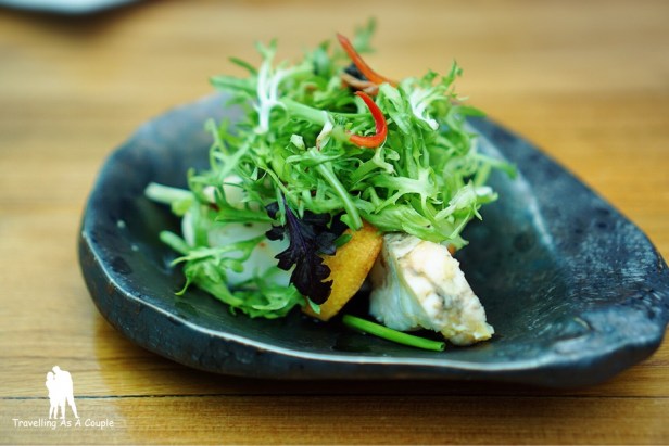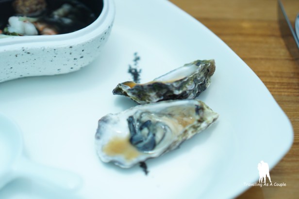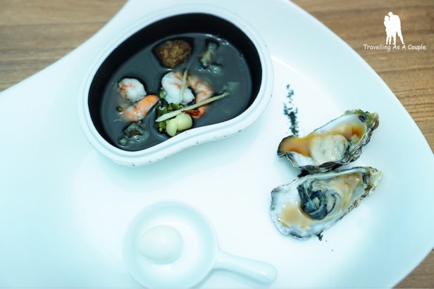 จานต่อมาเป็นซุปมิโสะหมึกปลาหมึก เสิร์ฟพร้อมกับหอยนางรมสดและไข่นกกระทา ซุปมิโสะอร่อยแปลกดี ตอนแรกก็นึกว่าหมึกปลาหมึกจะคาวๆ หน่อย แต่อันนี้ไม่คาวเลย หอยนางรมก็สดมาก เข้ากันอย่างไม่น่าเชื่อ