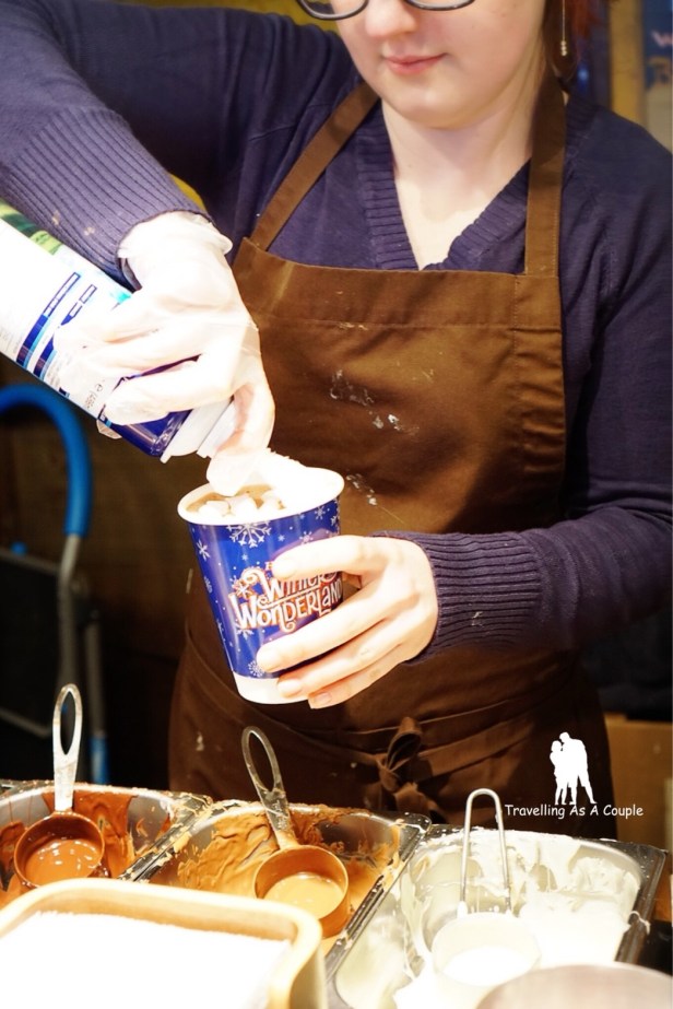ด้วยความที่เป็นคนชอบกินช็อคโกแลต พอเจอช็อคโกแลตร้อนๆ นี่แทบพุ่งเข้าใส่ เลือกแบบที่ใส่มาชเมลโล บีบวิปปิ้งครีมด้านบน เรียกได้ว่าจัดเต็มมีอะไรใส่มาให้หมด