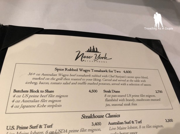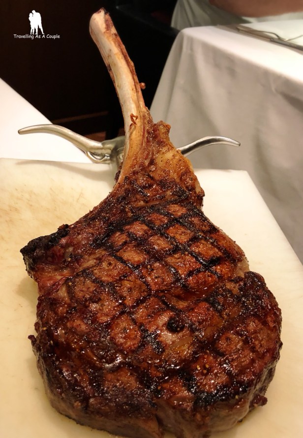 ส่วนของคาว มาคราวนี้เราดูเมนูมาจากบ้านแล้วจ้า เรียกได้ว่าเลือกมาจากบ้านล่วงหน้าเลยก็ว่าได้ เลยสบายหน่อยไม่ต้องเสียเวลามาก เราไม่มีพิธีรีตองใดๆทั้งนั้น ไม่มี Starter กับ Appetizer เพราะเมนูที่จะมาลองในวันนี้คือ “Spice Rubbed Wagyu Tomahawk for two” เนื่องจากเนื้อจานนี้หนักร่วมๆ 1 Kg เราเลยตัดเมนู Starter กับ Appetizer ทิ้งไปหมด เกรงว่าจะกินเนื้อไม่หมด อีกจานนึงที่เราจะกินคือ… US Prime Surf and Turf เป็นเมนูกุ้งมังกรที่เสิร์ฟมาพร้อมสเต็กเนื้อสันใน