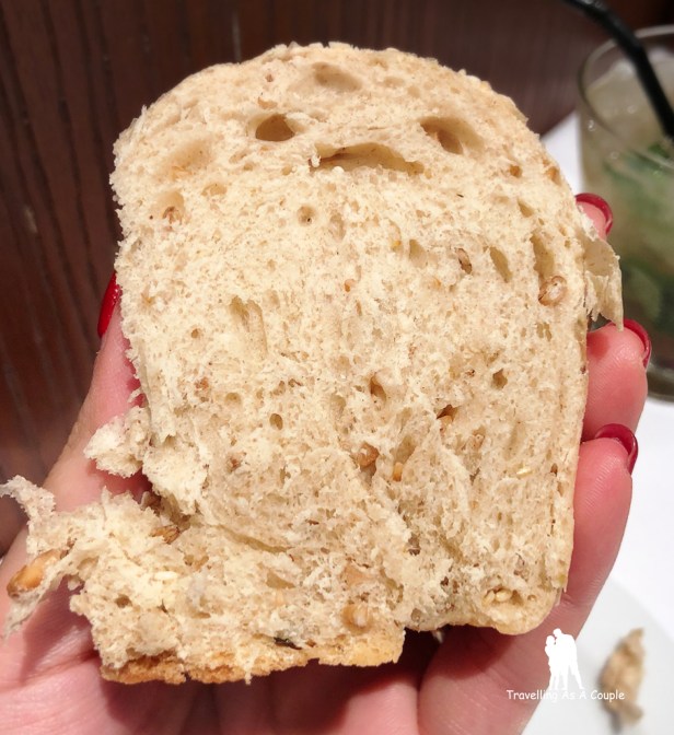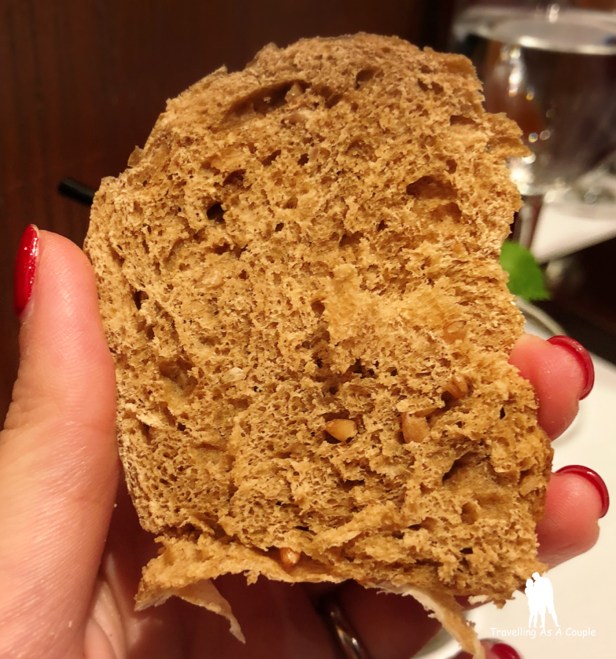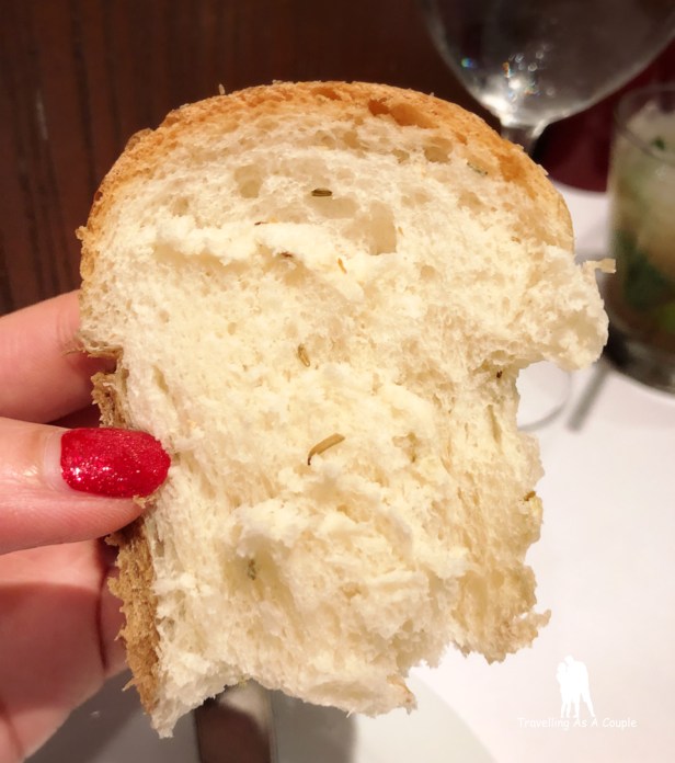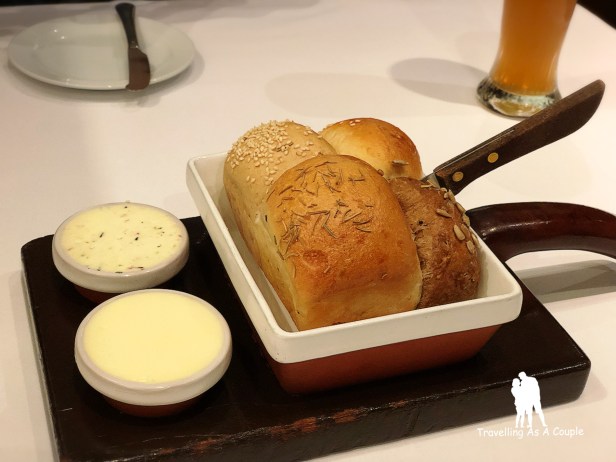 เปิดจานแรกด้วย Complementary Bread ขนมปัง 4 รสชาติ อบมาแบบร้อนๆ หอมน่ากินมาก พร้อมเนยสด 2 แบบ คือ Butter เนยแบบธรรมดา และ Garlic Butter เนยกระเทียม แต่เตือนว่าอย่าเผลอกินเพลิน เดี๋ยวจะอิ่มก่อนอาหารมื้อหลักจะมา เราเลยแค่ชิมให้รู้รสชาติพอ