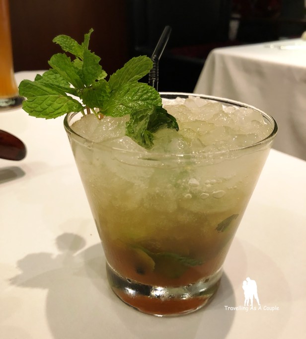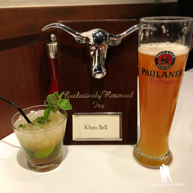 เริ่มต้นสั่งได้ ประเดิมด้วยเมนูเครื่องดื่ม พอเห็นราคาน้ำเปล่า ขุ่นพระ น้ำเปล่าขวดละ 260 บาท แต่อ่ะๆๆ โรงแรมนี่เนอะ ยังไงก็ต้องแพงอยู่แล้ว ราคาน้ำเปล่าแพงกว่า Mocktail อีก เราเลยจัด Non-Alcohol Cocktail : Virgin Mojito ไป ส่วนคุณสาก็จัด Imported Beer ไป …..จริงๆแล้วปกติ สเต็กเนื้อต้องกินกะไวน์แดงถึงจะเหมาะ แต่เนื่องจากคุณแม่ให้นมลูกอยู่เลยไม่มีคนช่วยคุณสากิน ถ้าคุณสากินคนเดียวคงจะไม่ไหวแน่ เลยอดไป