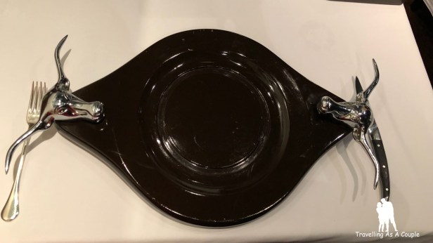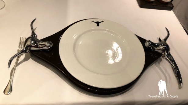 ระหว่างรออาหารมาเสิร์ฟ พนักงานก็ยกจานมาวางไว้ตรงหน้า มันใหญ่มาก และท่าทางน่าจะหนักมากเช่นกัน จานเป็นไม้ มีรูปกระทิงอยู่ที่มุมสองข้าง ซ้ายขวา มาพร้อมด้วยมีดที่คมกริบ หั่นเนื้อกินแบบมันส์มือ