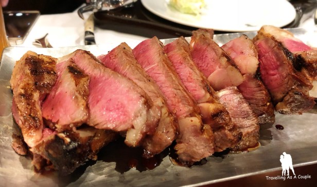 เนื้อจานนี้ไม่ต้องหั่นเองจ๊ะ พนักงานเค้ามารอหั่นให้เรากินอยู่แล้ว เค้าเอาเนื้อมาวางให้เราดู พร้อมถ่ายรูปเสร็จสรรพ ก็เอาไปหั่นมาวางเรียงให้เรากินอย่างสวยงาม ไม่ต้องเปลืองแรงหั่นเอง เอาแรงไปกินเนื้อ 1 Kg ให้หมดดีกว่า