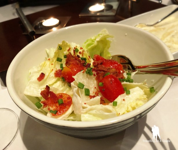 มาเริ่มด้วยจานแรก Super Main Course ของเราวันนี้ “Spice Rubbed Wagyu Tomahawk for two” เนื้อออสเตรเลี่ยนวากิว หนักประมาณ 1 Kg ชิ้นใหญ่ยักษ์หมักและนำมาย่างไฟหอมมาก วันนี้เรากินแบบ Medium Rare เพื่อให้ได้รสชาติเนื้อที่แท้จริง ในเซ็ทนี้นอกจากเนื้อสเต็กแล้วยังมีสลัด และก็ Truffle Mashed Potatoes เสิร์ฟมาพร้อมกันด้วย