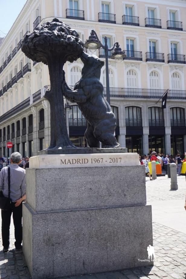 อิ่มแล้วก็เดินชมเมืองต่อได้ เดินมาจากร้าน Chocolateria San Gines ไม่ไกลจะเจอกับ ที่แรกคือน้องหมีปีนต้นไม้ มันคือ จัตุรัส Puerta Del Sol