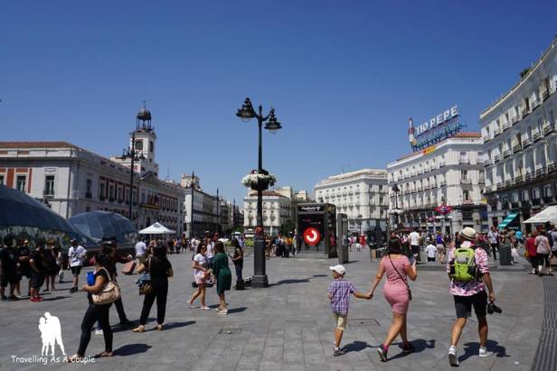 จัตุรัสที่อยู่ใจกลางเมือง สามารถนั่งรถใต้ดินมาลงได้เลย แต่เราเดินเล่นมาจากร้าน Chocolateria San Gines เดินเล่นมาเรื่อยๆ เพลินๆ ถ้าหาไม่เจอให้มองหา รูปปั้นหมีปีนต้นไม้ หรือ Bear and the Mandrono Tree ซึ่งเป็นสัญลักษณ์ของเมือง Madrid