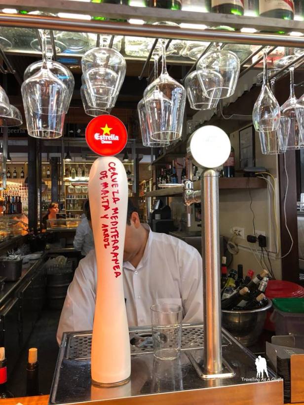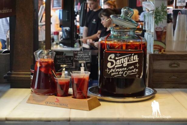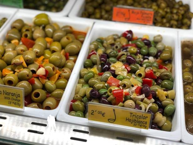 ถึงแล้ว ตลาด San Miguel หน้าตาภายนอกอาจจะดูไม่เป็นตลาดเท่าไหร่ ด้านในติดแอร์ทั้งหมด ปัจจุบันนี้เป็นตลาดที่เก่าแก่ที่สุดใน Madrid พอเดินเข้าไปข้างในจะคับคั่งไปด้วยนักท่องเที่ยวที่มาจับจองที่นั่งตามบาร์ต่างๆเพื่อรับประทานอาหาร