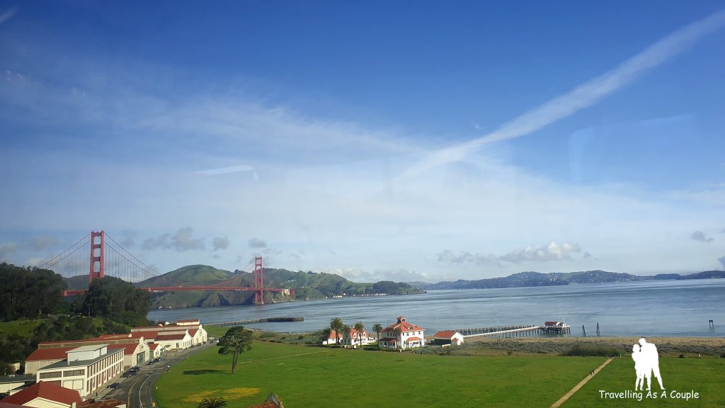 วิวสะพาน Golden gate จากบนรถบัส วิวสวยมากกกก อากาศดี ท้องฟ้าเปิด เห็นสะพานแบบเต็มๆ