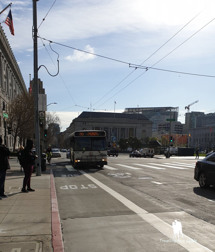 นั่งรถบัสที่ Civic Center สาย 30 เราสามารถใช้บัตร Clipper จ่ายเงินได้ จำราคาไม่ได้ แต่ไม่เกินคนละ 8 USD