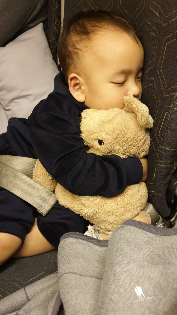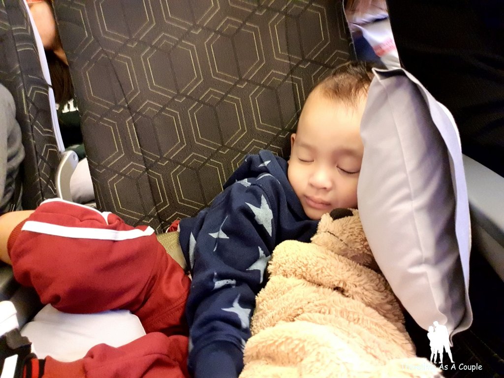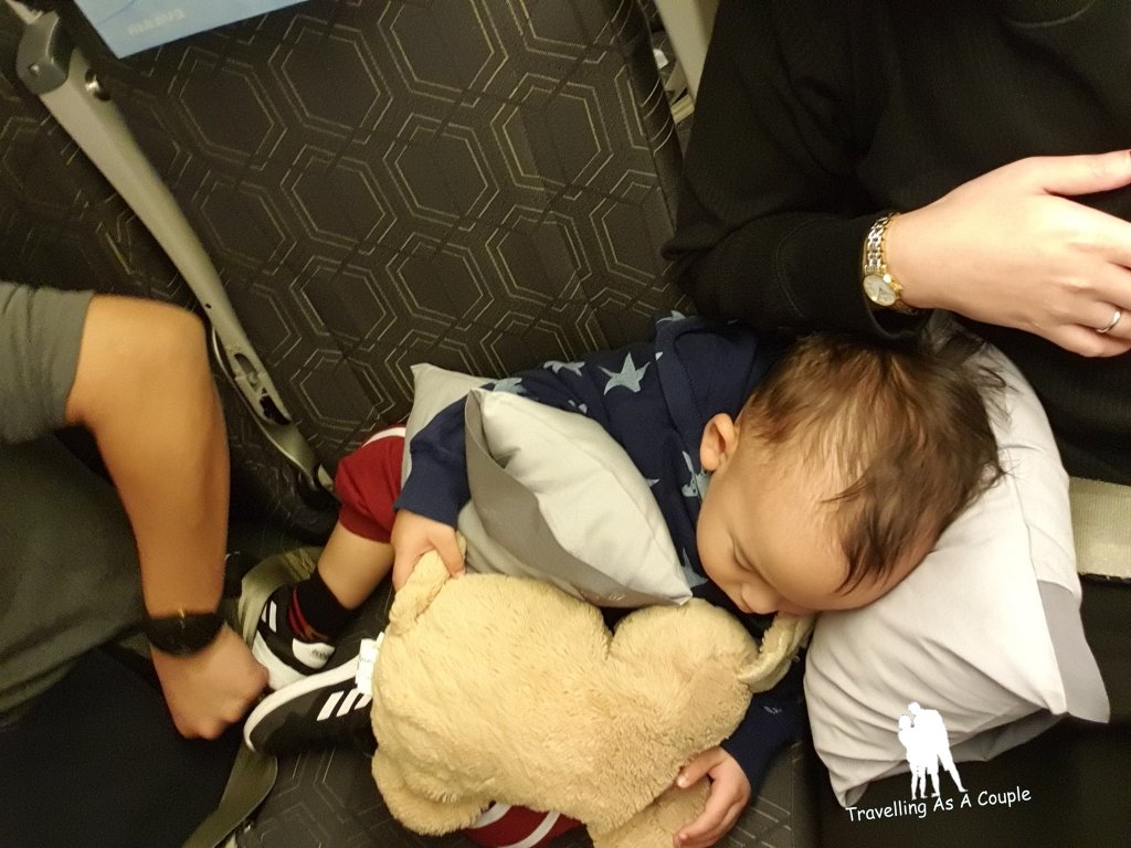 ความยากคือตอนเครื่องขึ้นลง ต้องเอาที่วางแขนลง รัดเข็มขัดนิรภัยให้เรียบร้อย เลยออกมาเป็นสภาพอย่างที่เห็นคือ เอาหมอนลองไว้ข้างนึง ให้พี่ควินน์หนุน แล้วก็เอาขาพาดที่วางแขนไว้ รัดเข็มขัดให้เรียบร้อย เพื่อความปลอดภัย แต่ตอนเครื่องขึ้นลง เราต้องเอามือกันไว้ ไม่ให้ลูกไหลตกลงมา พอเครื่องขึ้นเรียบร้อย ถึงจะเอาที่วางแขนขึ้นได้ ก็จะนอนยาวแบบสบายๆ
