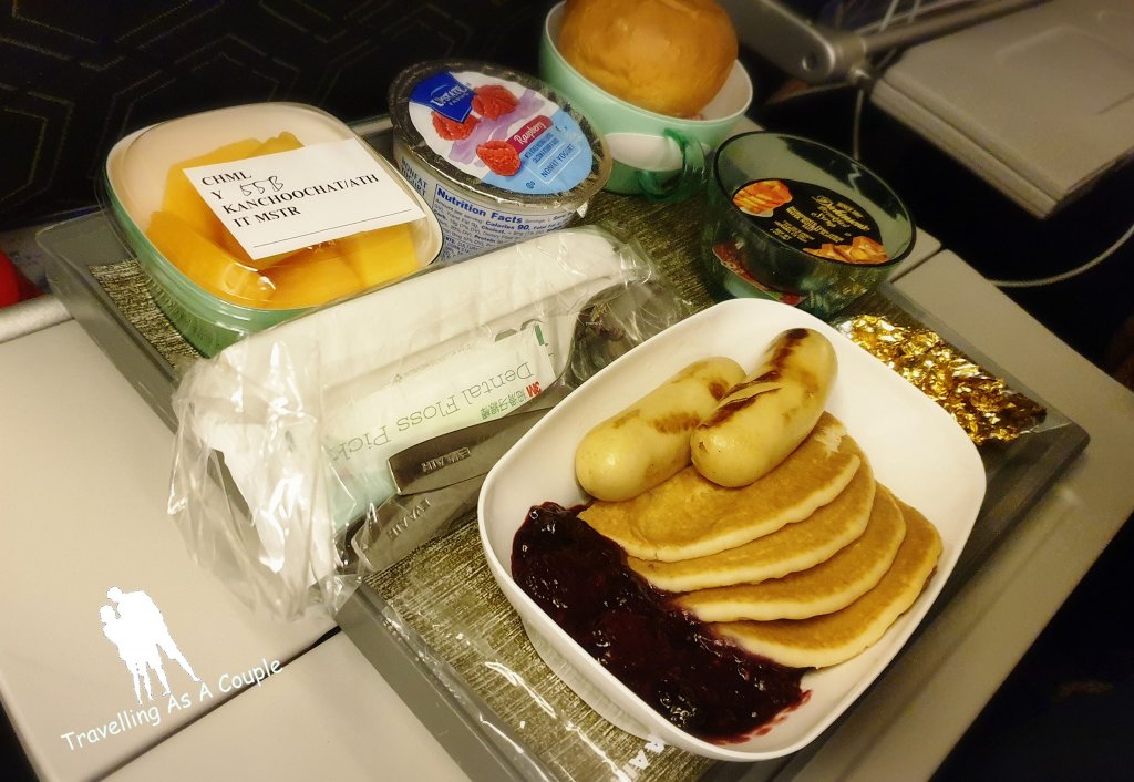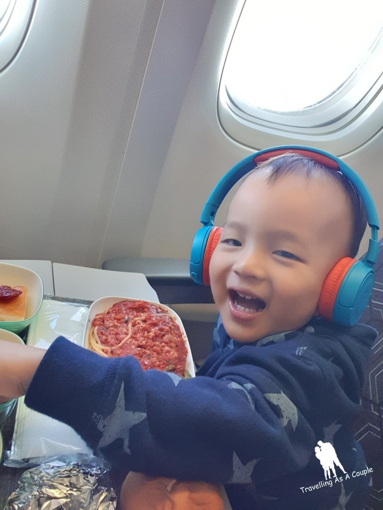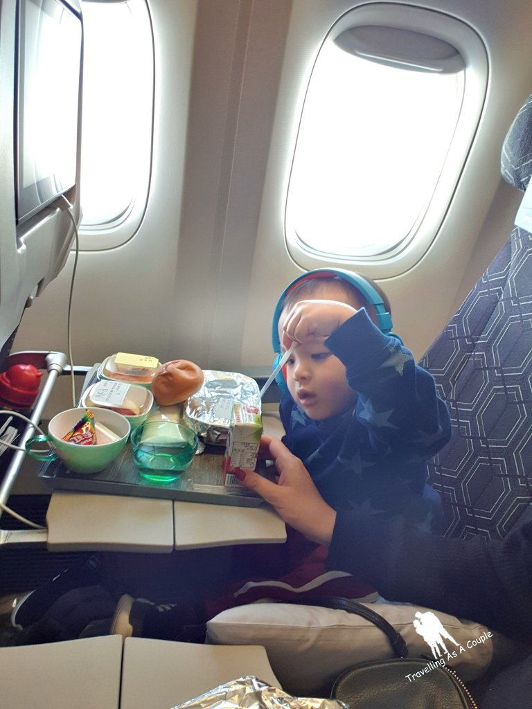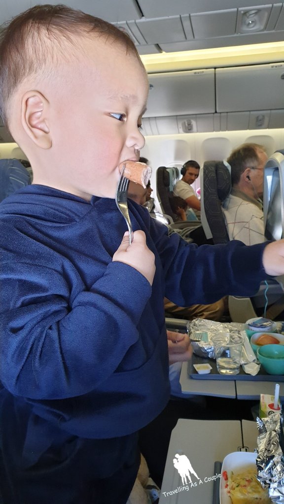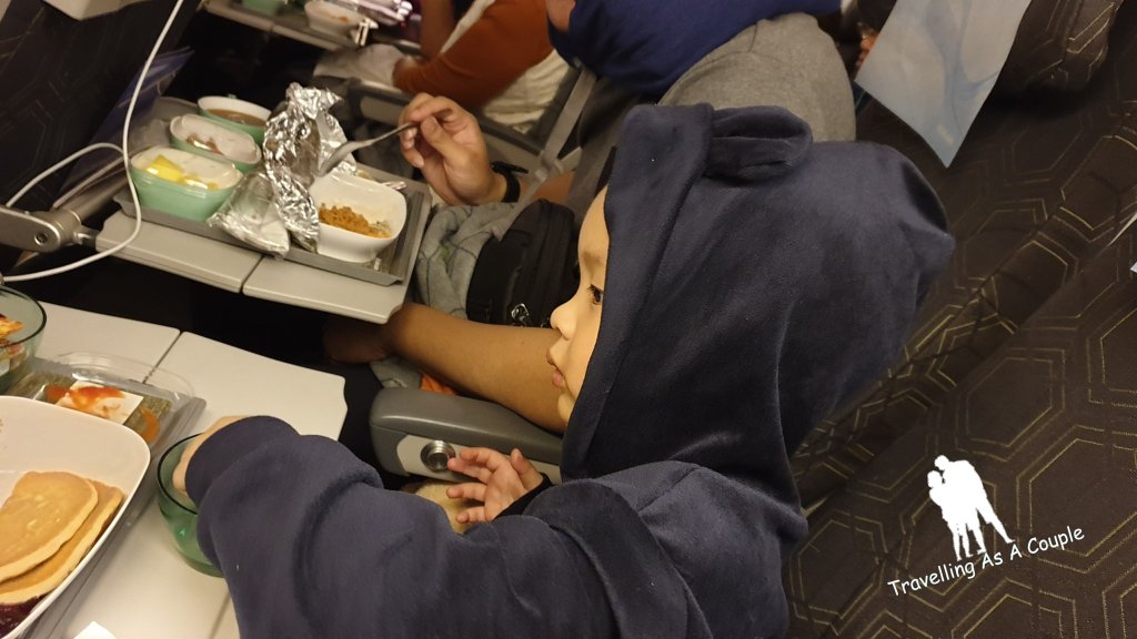 คราวนี้เราไม่ได้กังวลเรื่องอาหารของลูกเท่าไหร่ ไม่เหมือนกับทริปแรก ที่เค้าเพิ่งขวบครึ่ง ยังกินอะไรไม่หลากหลาย ทริปนี้พี่ควินน์ 2 ขวบ 4 เดือนแล้ว สามารถกินอาหารปกติทั่วไปได้แล้ว ตอนที่จองตั๋วเครื่องบินเราเลยระบุ ความต้องการว่า ต้องการอาหารเด็กธรรมดา ไม่ใช่แบบอาหารเด็กเล็กแล้ว เราเตรียมนมไปหลายกล่องเลย แต่ด้วยความตื่นเต้น ลูกกินไป 1 กล่องถ้วน แม่นี่ถือเป้ใส่นมจนปวดหลัง