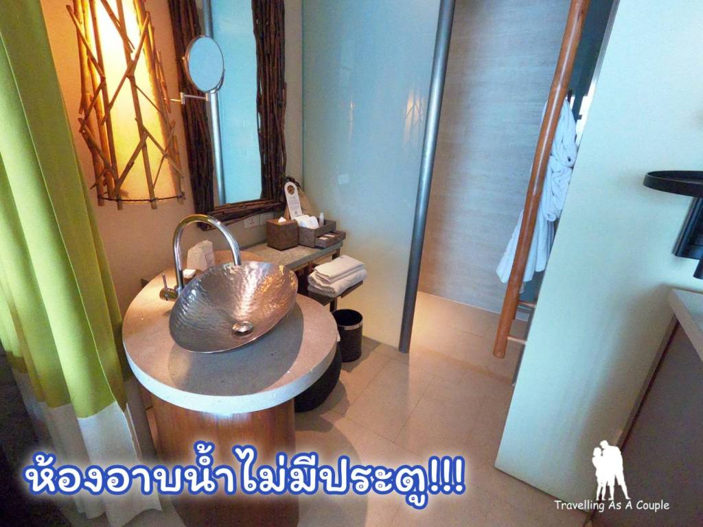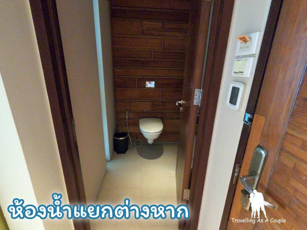 ห้องน้ำและห้องอาบน้ำแยกกัน ซึ่งห้องอาบน้ำไม่มีประตู ..มีม่านกั้น