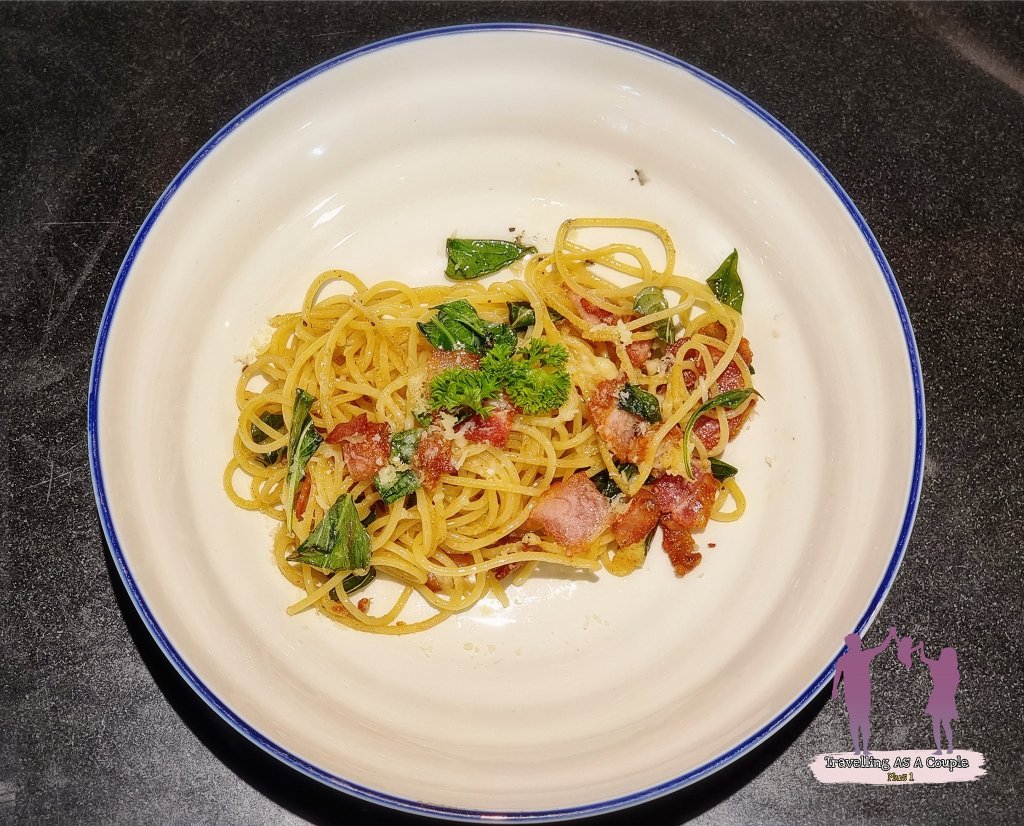 #สปาเก็ตตี้เบคอนพริกแห้ง จานนี้สั่งให้เด็กน้อย เลยต้องแยกพริกแห้งและไม่ใส่พริกไทย รสชาติเข้มข้น แต่ติดอย่างเดียว ลวกเส้นแข็งไปนิด
