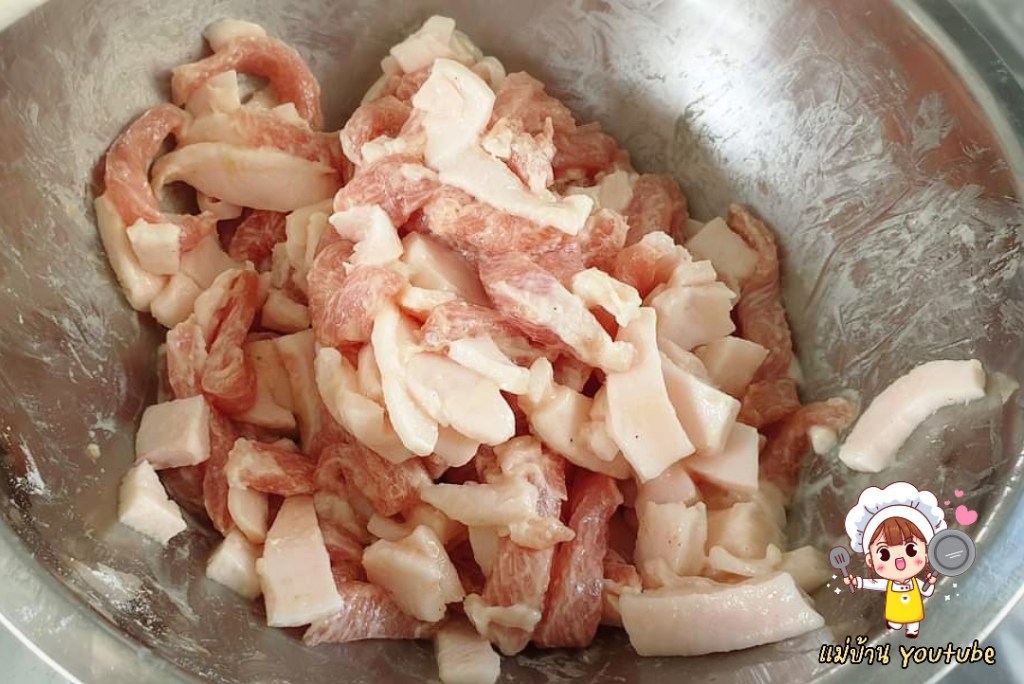 • หั่นสันคอกับมันหมูเป็นชิ้นยาวๆ