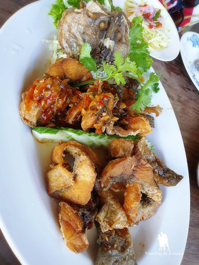 ปลากระพง 2 ใจ ครึ่งนึงเป็นปลาทอดน้ำปลา อีกครึ่งนึงเป็นปลาสามรส จานนี้ชอบมากๆๆ เอาไปเลย 5 ดาว (เต็ม 5) ปลาทอดกรอบปรุงรสด้วยน้ำปลามาแบบพอดี