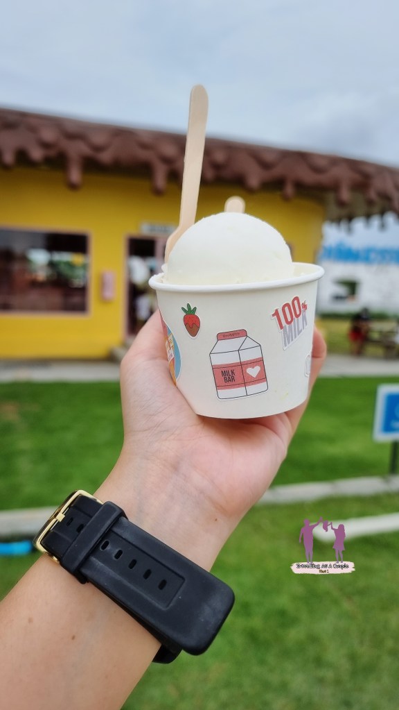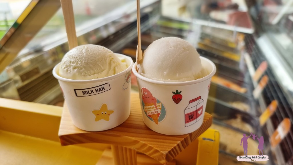 ร้านจะแบ่งที่นั่งเป็น 2 ฝั่ง สีเหลืองจะเป็นคาเฟ่ไอศครีมโฮมเมด ราคาเริ่มต้นที่ 77 บาท อยากชิมรสไหนก็ขอลองชิมก่อนได้ อีกด้านจะเป็นคาเฟ่สายหวานสีชมพู Milk Bar แต่งร้านแบบคุมโทน สีชมพูหวานแหว๋ว