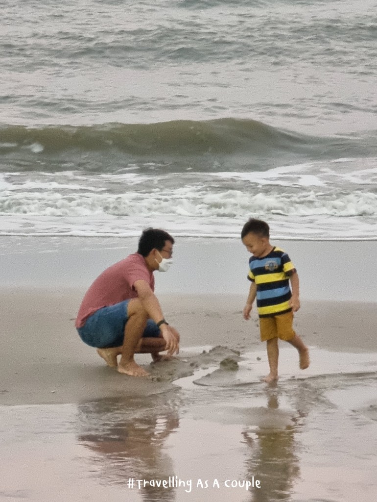 ระหว่างที่รออาหารเราก็ให้ลูกไปเล่นทรายเล่นทะเลกับพ่อก่อน ไม่ต้องมานั่งรอที่โต๊ะ อาหารมาแล้วค่อยเรียกขึ้นมา แต่ก็อาจจะเรียกยากนิดนึง เด็กกับทรายเป็นของคู่กัน พอมันเพลินๆแล้วก็เรียกไม่ค่อยจะมา