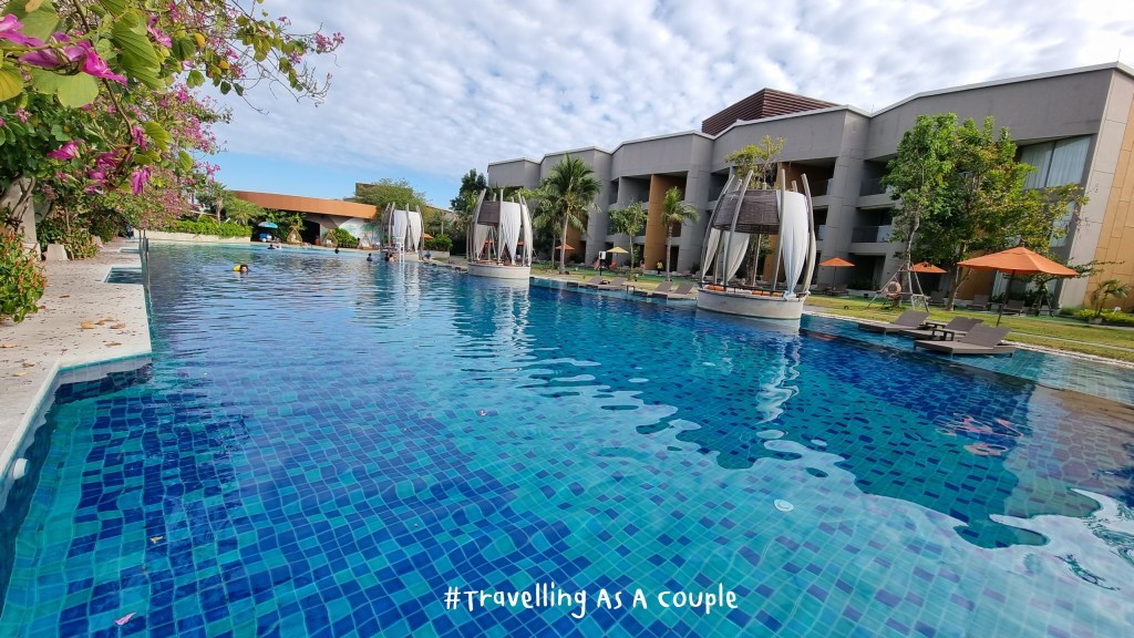 - ด้วยความที่โรงแรมนี้จะออกเป็นแนวยาวจากถนนไปจนถึงริมทะเล ที่พักจะแบ่งเป็น 4 Zone คือจะเป็น ตึกที่เป็น Pool Access 2 Zone แรก แล้ว Zone ที่ 3 จะเป็นส่วนของ Logoon แล้วก็สุดท้ายจะเป็นส่วนของร้านอาหารที่อยู่ติดริมทะเล ถ้าใครพัก pool Access ที่เป็นตึกแรกที่อยู่ติดกับ lobby โรงแรมจะมีความห่างไกลทะเลพอสมควร แต่ว่ายังเดินได้ หรือจะขี่จักรยาน หรือว่านั่งรถกอล์ฟก็ได้