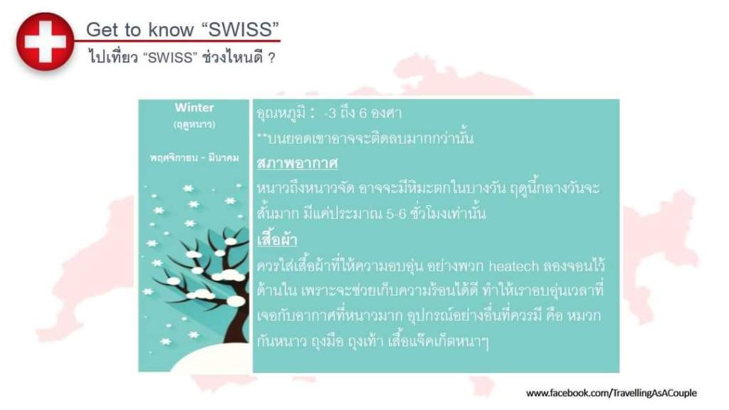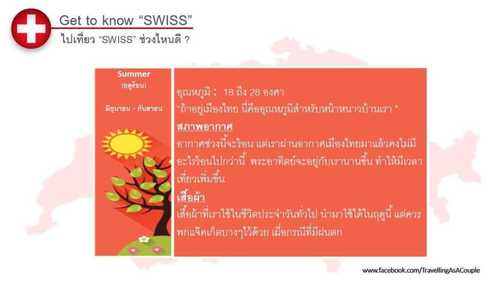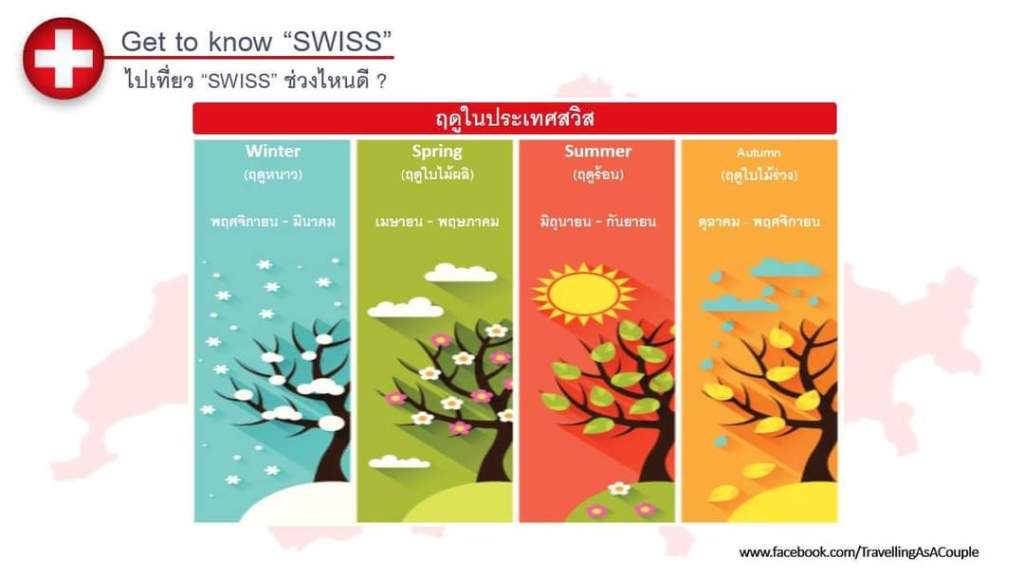 แต่ในความเป็นจริงการจะไปเที่ยวที่ไหน เราต้องมาดูก่อนว่าหน้าท่องเที่ยวของสวิสคือเมื่อไร แล้วสภาพอากาศของสวิส เป็นยังไงในแต่ละฤดู ก่อนที่เราจะตัดสินใจว่าจะมาเที่ยวสวิสช่วงไหน