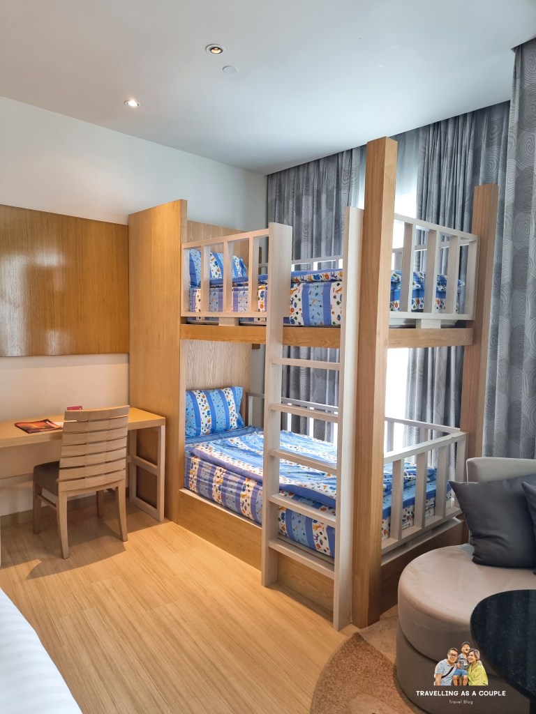 ห้อง Family Seaview เหมาะกับบ้านที่มาเป็นครอบครัวแบบผู้ใหญ่ 2 คน เด็ก 2 คน ห้องพักจะเป็นเตียงขนาด King Size + กับเตียง 2ชั้น เด็กๆชอบมาก ตรงเตียง 2 ชั้นนี่แหละ เพราะว่าได้ปีนเตียงขึ้นไปนอนที่ชั้น 2 แต่ก็ต้องแอบระวังนิดนึง เพราะว่า ตอนขาปีนลง เจ้าเด็กน้อยบ้านนี้เกือบตกเตียงลงมา ดีที่รับได้ทัน การจัดวางห้องอย่างอื่นแทบจะเหมือนกับห้อง Deluxe Seaview เลย